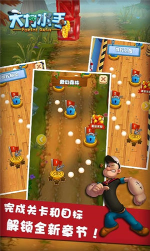 1、玩家将扮演大力水手,尽可能收集道具和金币,灵活避开各种障碍,到达终点并努力挑战高分。