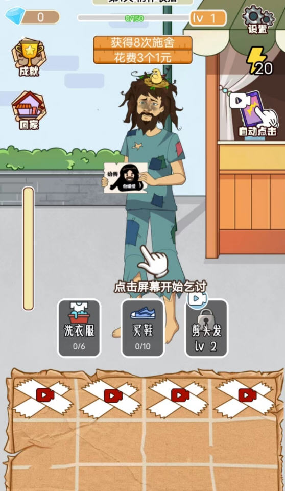 2、玩家为乞丐(小帅),以乞讨为主贯穿整个游戏,通过乞讨引领游戏进程,邋遢不体面的形象,通过乞讨改变自我,从解决温饱开始,吃饱穿暖,交上女朋友,用上手机有代步的自行车,到后来拥有豪华大别墅,数台豪华车等等所有奢华,想有的都拥有。